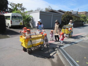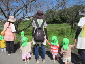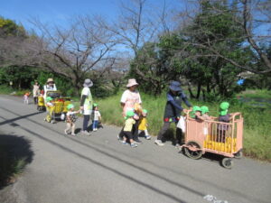 さわやかな秋晴れの今日。ひよこ組とこりす組で河川敷までお散歩に行ってきました。歩けるときは歩いて、疲れたときには散歩車に乗ってののんびりとしたお散歩でした。