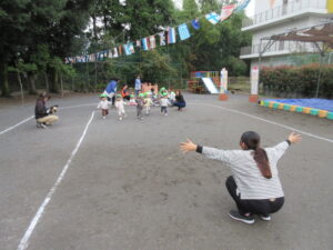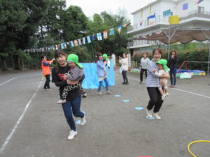 今日は2回目の運動会の予行練習です。かけっこと先生を代役にしての親子競技を頑張りました。