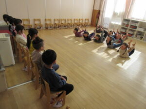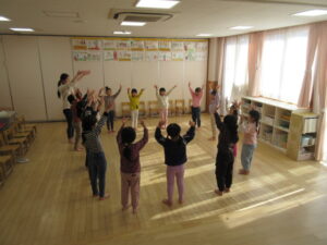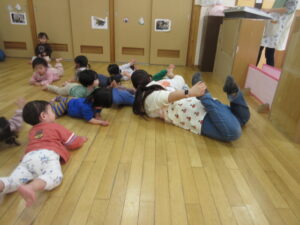 こりす組ときりん組でリズム遊び(リトミック)をしました。動物になりっきて体を動かしたり、音楽に合わせてリズムをとりながら体を動かしたり・・・