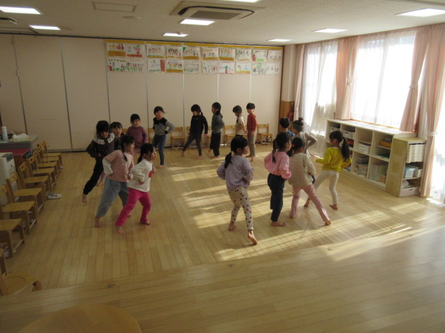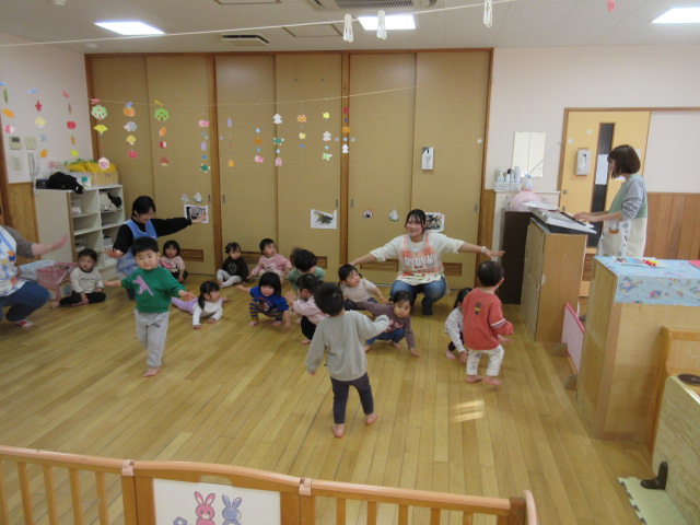 歌やリズムにあわせて体を動かして遊びます。手をたたくだけでなく、お腹や肩、おしりといった体の一部分を叩いたりすると子どもたちは大喜びです。0歳児から5歳児まで、子どもの成長に合わせて、リズム遊びのアイデアを工夫しています。楽しみながら音楽の感性を高めていければと思っています。