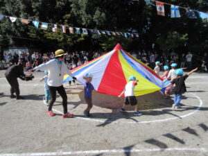 秋晴れの中の運動会。元気いっぱいのかけっこやヨチヨチ歩きのかけっこ、みんな頑張りました。お父さん、お母さんと一緒の親子競技も微笑ましかったです。うさぎさんのダンスも可愛らしかったですね。
