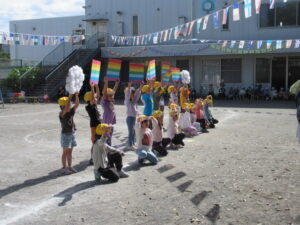 旗を持ったダンスからバルーンを使った表現まで、元気いっぱいに演技できました。運動遊びは雲梯や鉄棒など、自分なりにチャレンジしてきた技を披露できました。