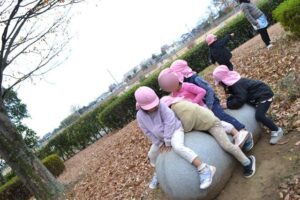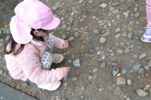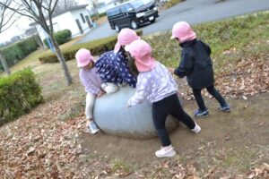 こちらでは丸い石の上に何人乗れるか挑戦したりと遊具はありませんが、いろいろな遊びを作り出して遊ぶ子どもたちでした。