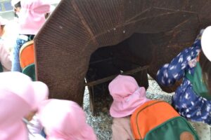 恐竜をなでなでしたり、顔の中をのぞき込んだり興味津々でした!
