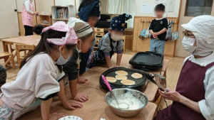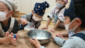 他のクラスは給食室から提供してもらいましたが、さくら組は自分たちで手作りパンケーキを作ってみることに!