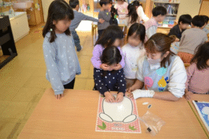 「福笑い」と「羽根つき」を先生が前に出て実演しました。
