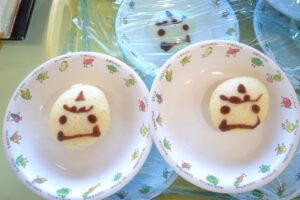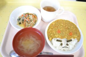 この日の給食は福豆カレー。おやつには鬼の子蒸しパンが登場しました(^▽^)/