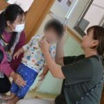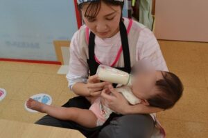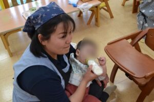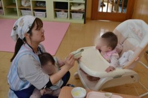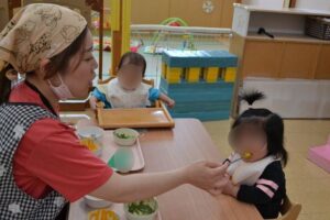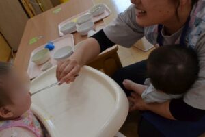 子どもたちの口の動きを見ながら先生が食べ物をスプーンで運びます。