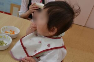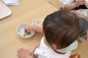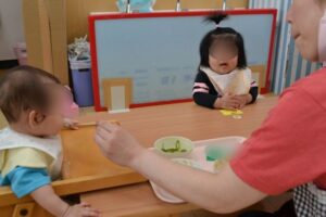 大きなお口を開けて、先生を見ながらぱくっと食べ物を取り込みます。