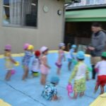 3歳児たんぽぽ組、4歳児ひまわり組、5歳児さくら組は大きなプールで冷たい水の感触を思いっきり楽しみました!!