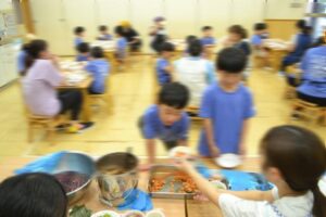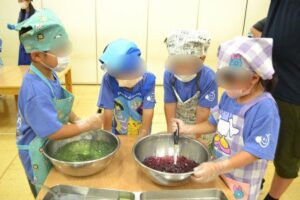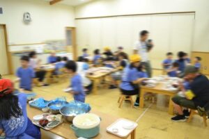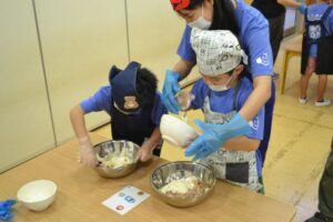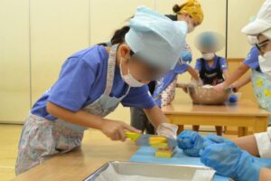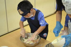 クラスTシャツに着替え、エプロンと三角巾を身に付けます。