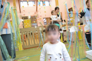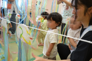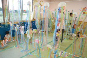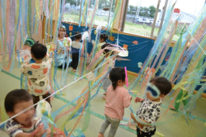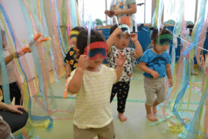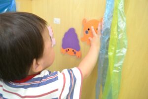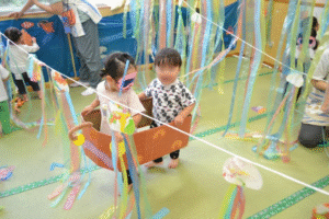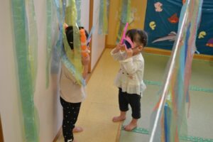 海の絵本を読んだ後、水中眼鏡をつけて、絵本と同じ、ちょうちんあんこうの潜水艦に乗り、いざ出発!