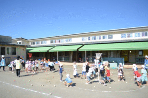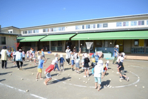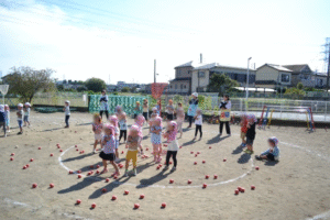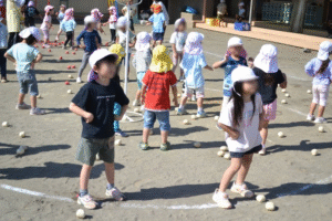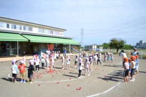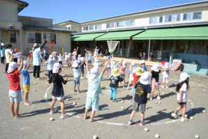 赤白チームに分かれてチェッコリダンスを踊ってから球を投げるのですが、たんぽぽ組は円の中から、ひまわり組は円の外から、さくら組はトラックを半周走って円の外から投げるルールでやりました。