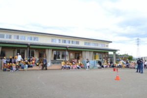 「園庭に避難してください」という放送を聞き、子どもたちは職員の誘導のもと園庭へ避難しました。