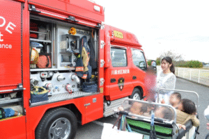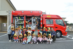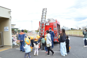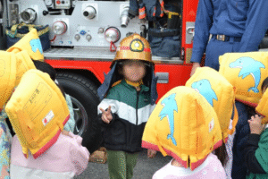 消防士さんが特別に、消防車の装備を間近で見せてくださり、子どもたちの質問にも丁寧に答えてくださいました。
