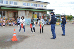 カラーコーンを火元に見たてて消火訓練