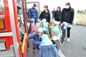 訓練の後は、子どもたちが楽しみにしていた 消防車の見学と記念撮影。