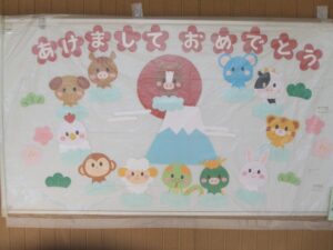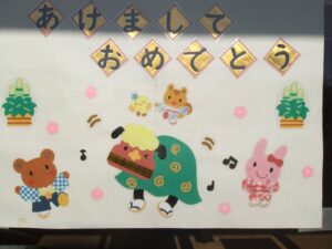 玄関や保育室の飾りつけもきれいにできました。きりんさんによる製作も干支にちなんで絵馬の扇飾りです。今年もどうぞ良い一年でありますように。