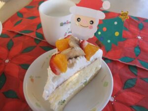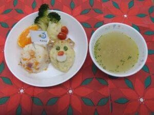 お待ちかねクリスマスランチです。メニューはエビピラフ、トナカイバーグ、ツリーポテト、オニオンスープ、みかんでした。おやつは素敵な手作りクリスマスケーキ!!!